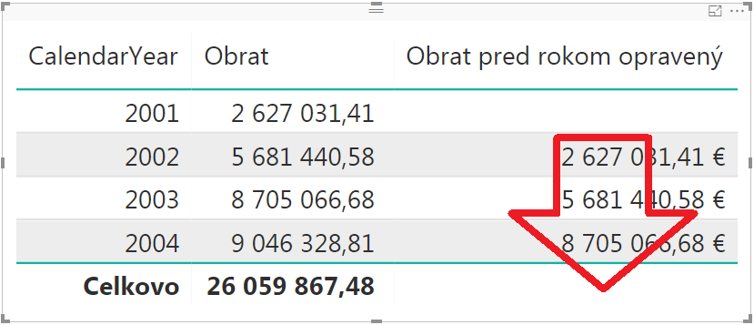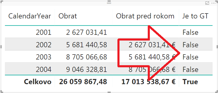 Je tam vypočítaná nejaká hodnota, ale má drobný logický problém – v celkovom súčte totižto nemá zmysel zobrazovať nič, lebo na tom riadku nie je žiaden rok. A teda nemá zmysel tam ani nič počítať. Preto tam ani my nechceme zobraziť nič. A na to budeme musieť najprv spraviť detekciu grand totalu, resp. to, že sme na úrovni celkového súčtu.
