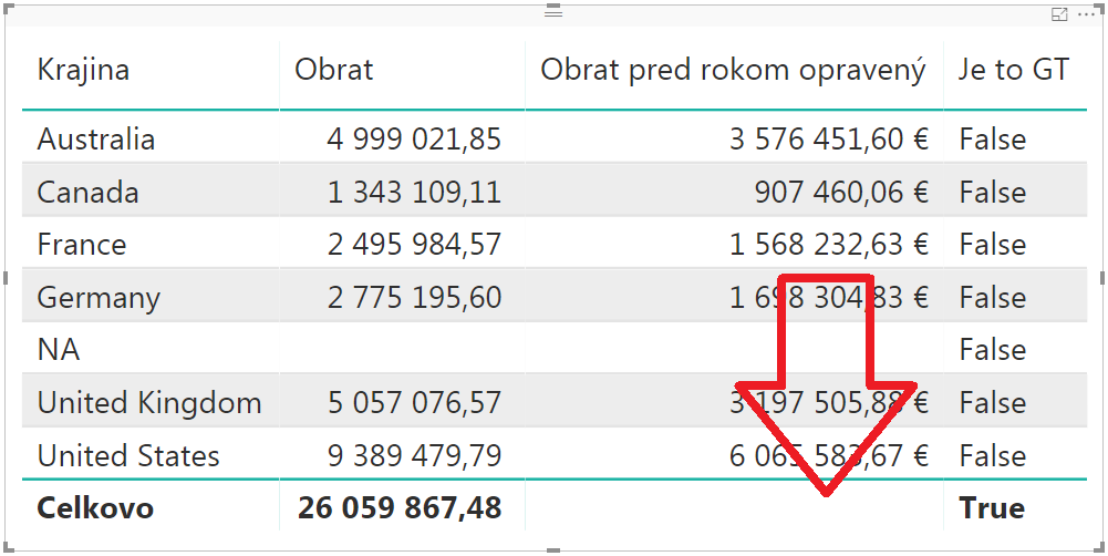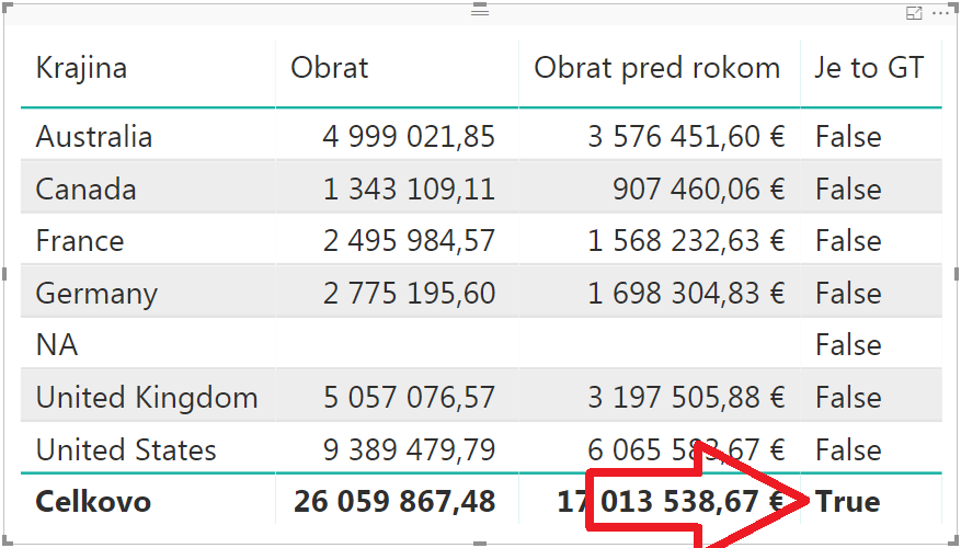 A takto jednoducho si viete detekovať grand total. Nie je to síce krátky vzorec, ale je relatívne jednoduchý. A stačí ho mať ako merítko v modeli iba raz. Takže ak sa vám zdá ťažký, tak si k nemu na chvíľu sadnite, a skúste ho pochopiť. A keby to náhodou aj bolo ťažké, tak si zapamätajte, že stačí nasypať za sebou funkcie ISCROSSFILTERED postupne pre každú tabuľku v dátovom modeli, a celé to znegovať cez NOT. A detekcia grand totalu je na svete 🙂