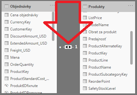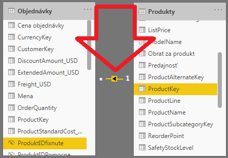Tieto dve tabuľky – Objednávky a Produkty, sú prepojené prepojením typu N:1, resp. Many-to-One, cez vyznačené stĺpce. Šípka na prepojení v strede určuje smer prepojenia, resp. smer prúdenia filtrov medzi tabuľkami v dátovom modeli v PowerPivote aj Power BI. Čiže ktorým smerom prúdia filtre z jednej tabuľky do druhej. V tomto prípade prúdia filtre v smere šípky, z tabuľky Produkty do tabuľky Objednávky. Čiže keď nastavíme filter nad tabuľkou Produkty, tak ten filter „prebuble“ vďaka tomuto prepojeniu a jeho smeru aj do tabuľky Objednávky. Kde vyfiltruje príslušné riadky. Pričom filtrami sa rozumejú kontextové filtre, ktorých niektoré zdroje sú uvedené v tomto článku. Má to aj inú funkciu, ale tomu sa teraz nebudeme venovať.