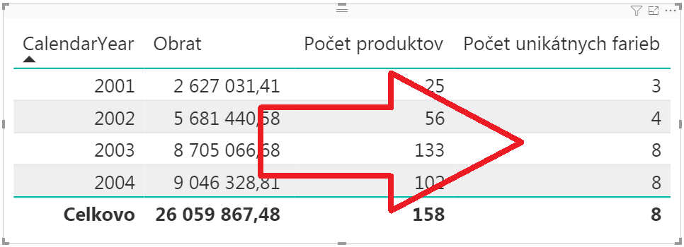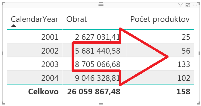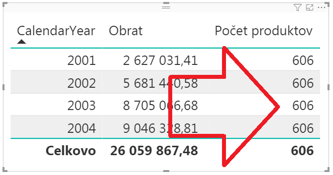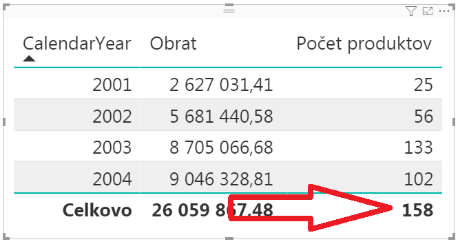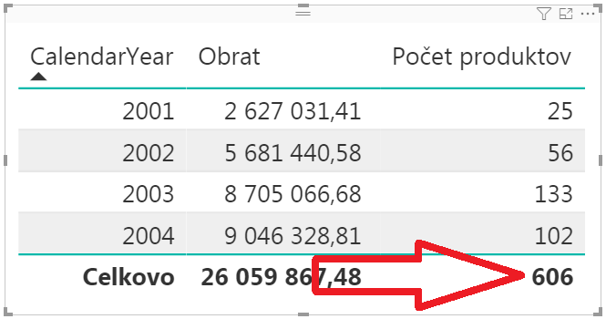 V skratke, tento vzorec vypočíta počet produktov, v kontexte výpočtu obmedzenom na objednávky z pôvodného kontextu výpočtu. Alebo, ak sa vám o tom nechce rozmýšľať, tak si to zapamätajte tak, že ak chcete niečo vypočítať v protismere prepojenia tabuliek, tak zabaľte pôvodný vzorec do funkcie CALCULATE, a do druhého parametra zadajte názov tabuľky pred tým protismerom prepojenia. To na bežné prípady spoľahlivo zaberie.