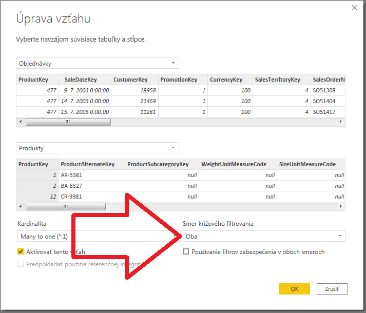 Ak ste teda v Power BI, tak rozkliknite dvojklikom tú šípku na prepojení. Otvorí sa okno, kde vpravo dole, v roletke „Smer krížového filtrovania“ (opäť super slovenský doslovný preklad), vyberte možnosť „Obe“, a stlačte tlačítko OK: