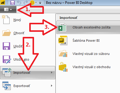 Potom si spustite Power BI Desktop. V ňom choďte do ponuky Súbor vľavo hore. V závislosti od operačného systému, jazykovej verzie a konštelácie hviezd, je tam napísané buď Súbor, File alebo je to len taký čierny symbol, ako vidno na obrázku nižšie. Kliknite naňho, a v menu vyberte Importovať -> Obsah excelového zošita: