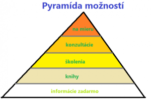 Možností, ako sa naučiť nové veci, je hneď viacero. Usporiadal som ich do tzv. Pyramídy možností, kde naspodu sú najlacnejšie možnosti, a navrchu sú najdrahšie možnosti. Jednotlivé stupne symbolizujú množstvo ľudí, ktorým je daný stupeň dostupný. Všetky z nich majú svoje výhody aj nevýhody, a práve tie si teraz pozrieme. Vo všeobecnosti platí, že čím rýchlejšia možnosť, tým drahšia.