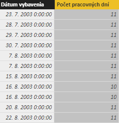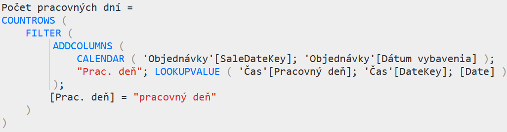 Počet pracovných dní = COUNTROWS(FILTER(ADDCOLUMNS(CALENDAR(‚Objednávky'[SaleDateKey]; ‚Objednávky'[Dátum vybavenia]); „Prac. deň“; LOOKUPVALUE(‚Čas'[Pracovný deň]; ‚Čas'[DateKey]; [Date])); [Prac. deň] = „pracovný deň“))