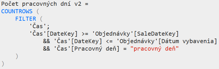 Počet pracovných dní v2 = COUNTROWS(FILTER(‚Čas‘; ‚Čas'[DateKey] >= ‚Objednávky'[SaleDateKey] && ‚Čas'[DateKey] <= ‚Objednávky'[Dátum vybavenia] && ‚Čas'[Pracovný deň] = „pracovný deň“))