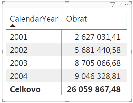 Výsledná kontingenčka bude zobrazovať Obrat po rokoch, a bude vyzerať takto: