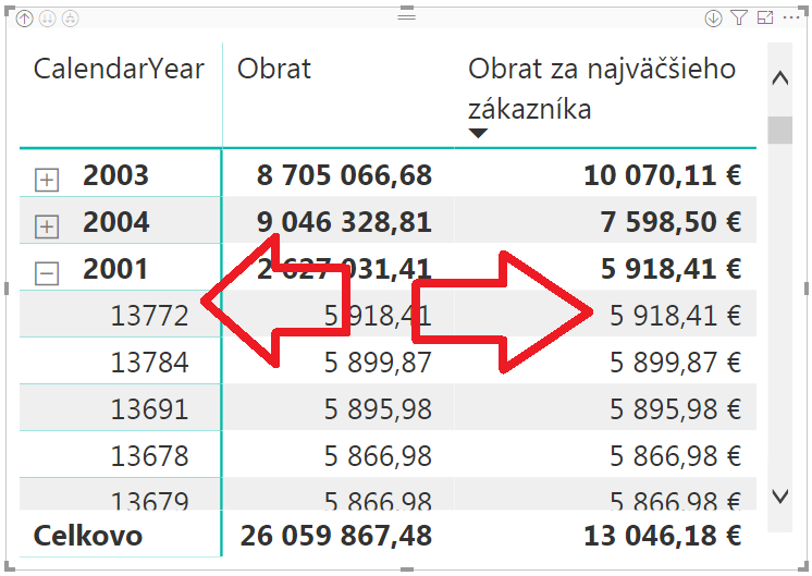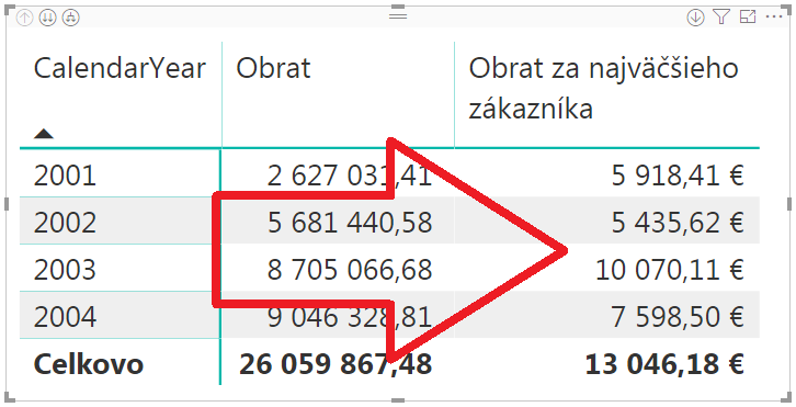 Vzorec funguje jednoducho. Najprv si funkciou VALUES vyberieme zoznam unikátnych zákazníkov v aktuálnom kontexte výpočtu. Čiže zoznam zákazníkov v aktuálnom roku. Je to to isté, ako keby sme si tento zoznam vytvorili zoskupením objednávok podľa zákazníka pomocou funkcie SUMMARIZE. Tento zoznam nám funkcia VALUES vráti ako jednostĺpcovú tabuľku. Následne zavoláme nad ňou funkciu MAXX, ktorá najprv pre každý riadok tejto tabuľky vypočíta hodnotu Obratu (čiže obrat za daného zákazníka v danom roku), a zo všetkých týchto obratov vráti najväčšiu hodnotu. Čo je najväčší obrat, resp. obrat za najväčšieho zákazníka v danom roku.