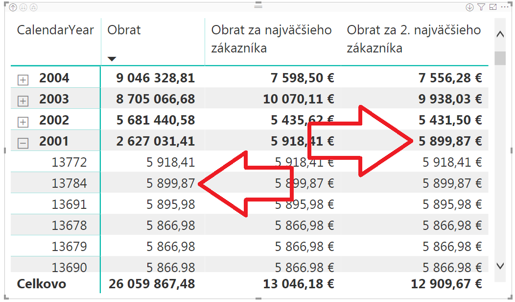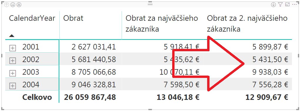Čo však v prípade, ak nás zaujíma druhá najväčšia hodnota? Čiže obrat za 2. najväčšieho zákazníka v danom roku? To spravíme týmto merítkom: