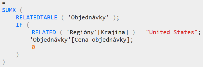 =SUMX(RELATEDTABLE(‚Objednávky‘); IF(RELATED(‚Regióny'[Krajina])=“United States“; ‚Objednávky'[Cena objednávky]; 0))