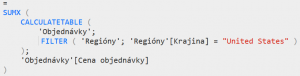 =SUMX(CALCULATETABLE(‚Objednávky‘; FILTER(‚Regióny‘; ‚Regióny'[Krajina]=“United States“)); ‚Objednávky'[Cena objednávky])